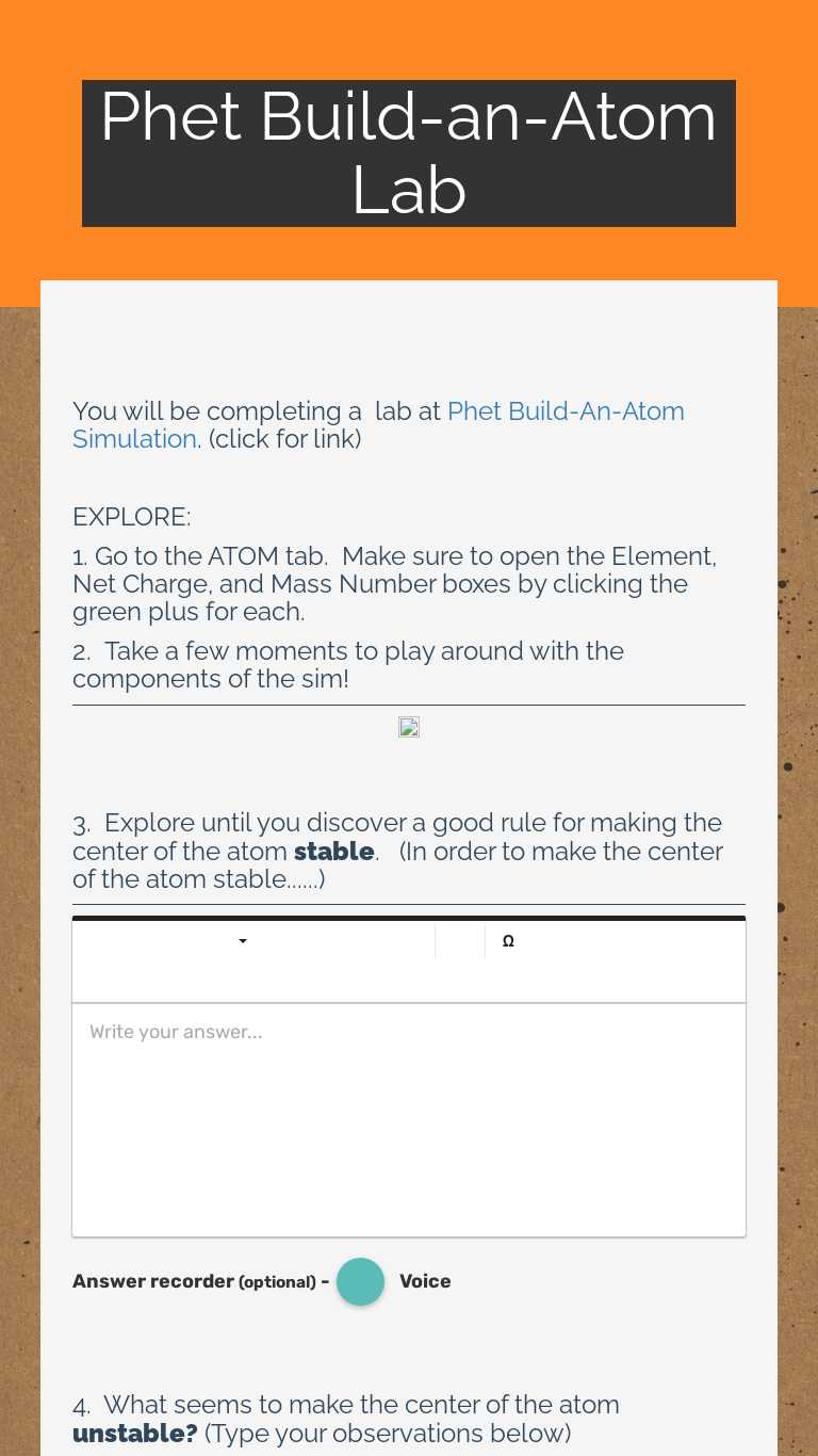 Simulator to build atoms, in which you can add protons, neutrons and electrons to create stable atoms and ions.. Then play a game to test your ideas! Simulator to build atoms, in which you can add protons, neutrons and electrons to create stable atoms and ions. Build an atom out of protons, neutrons, and electrons, and see how the element, charge, and mass … Create your atom with this … A student would add neutrons to the nucleus until the atomic mass is correct. Use the number of protons, neutrons, and electrons to draw a model of the atom, identify the … Sep 03, 2018 · build an atom. Then play a game to test your ideas!